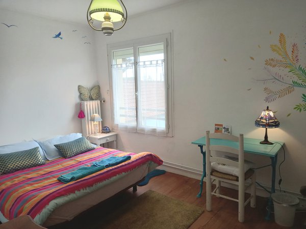 La spacieuse chambre “Arc-en-ciel” vous invite à la détente grâce à son décor mural unique au-dessus du lit et à une atmosphère lumineuse et apaisante. Cette chambre donne directement sur le jardin, offrant une vue calme et verdoyante pour des réveils tout en douceur.